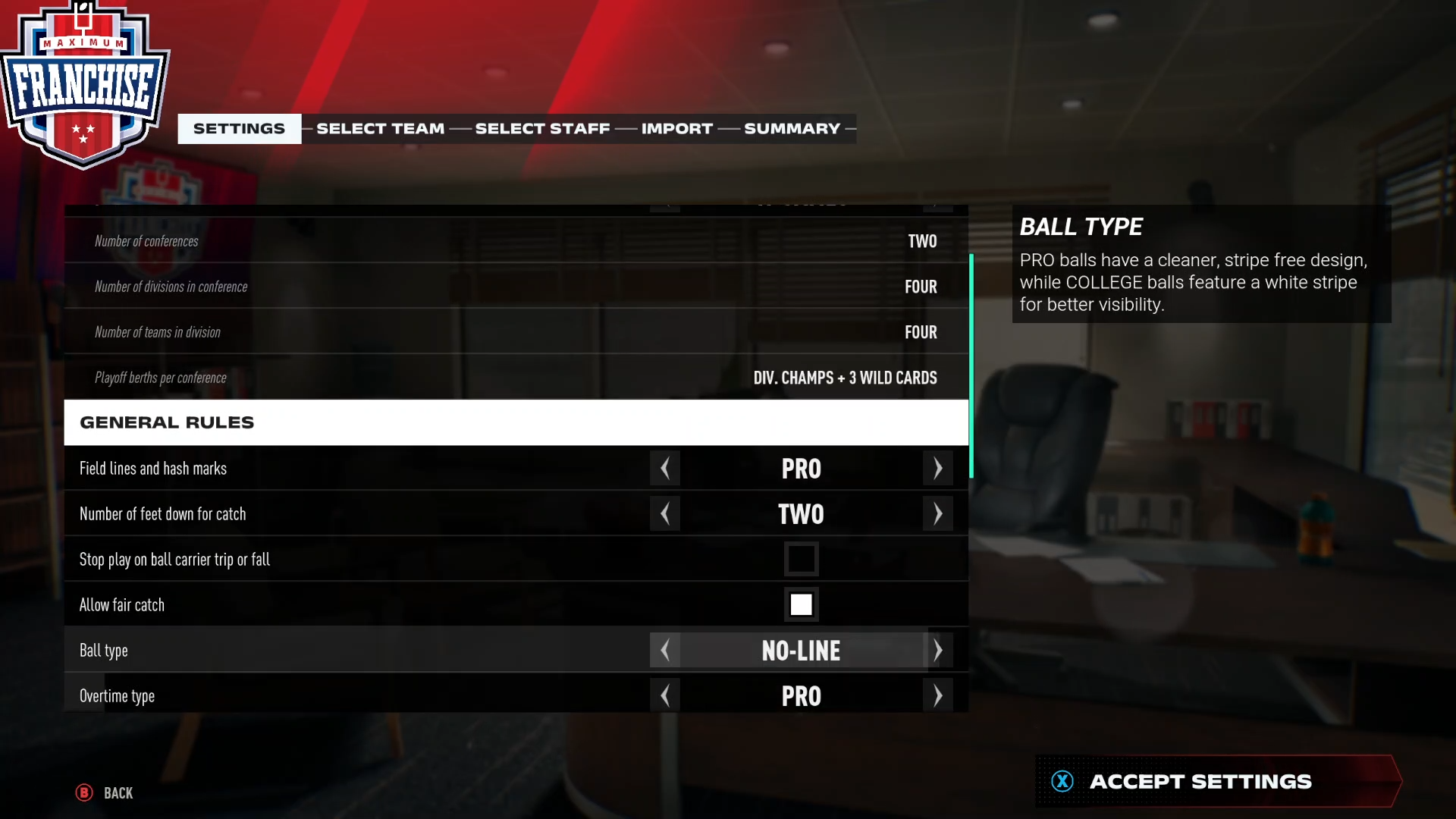 Franchise mode is all about freedom and customization. It starts with your League Setup, where you’ll find more options than any other franchise experience in football gaming.